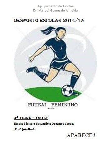 Desporto Escolar - Futsal Feminino por MOODLE AEMGA - quarta-feira, 8 de outubro de 2014 às 09:17 Número de respostas: 0 Hiperligação permanente