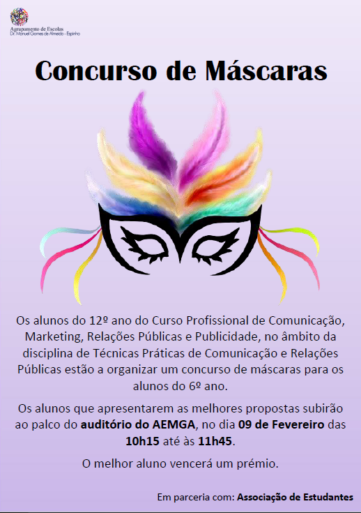 Concurso de máscaras - alunos 6.º ano por MOODLE AEMGA - sexta-feira, 9 de fevereiro de 2018 às 16:19 Número de respostas: 0 Hiperligação permanente