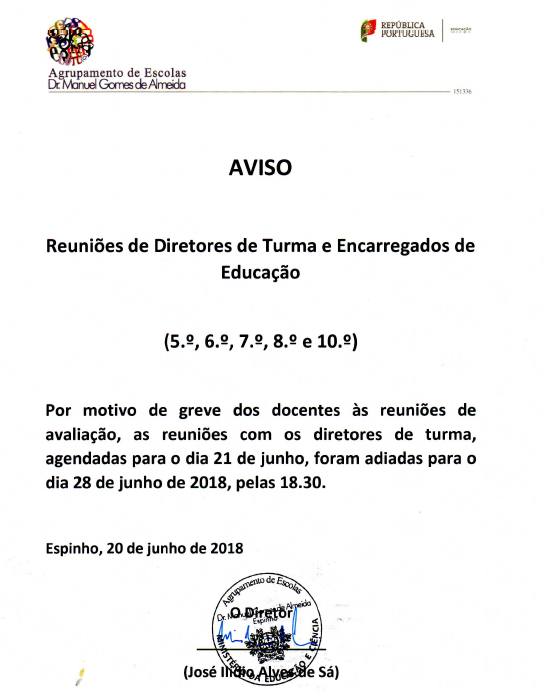 Aviso - Reuniões de Diretores de Turma e Encarregados de Educação por MOODLE AEMGA - quarta-feira, 20 de junho de 2018 às 11:25 Número de respostas: 0 Hiperligação permanente